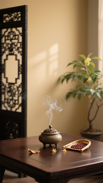 一张木纹桌面上,右侧放置着一个黑色镂空雕花屏风,屏风后有一盆绿色盆景,背景是柔和的暖黄色调,光线从左上角斜射过来,在粗糙质感的墙面上投下斑驳的光影,营造出宁静而古朴的氛围,环境变换为传统中式书房的角落,光线柔和温馨,整体风格统一且具有古典韵味。