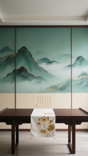 新中式风格室内场景,画面整体以青绿色为主色调,搭配淡雅的米色和深棕色,背景墙采用水墨晕染技法,呈现出青绿色的山峦云雾自然景观,金色的流畅线条勾勒出山势走向并点缀其间,底部有米色区域,上面有金色的书法文字,前景是一张深棕色的木质桌子,桌面上铺着一块带有金色莲花图案的白色桌旗,整体营造出宁静雅致、富有东方韵味的氛围,光影柔和,色彩和谐统一,具有传统与现代结合的设计感。