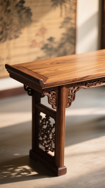 一张中式古典风格的实木长桌特写,桌面呈现温润的浅棕色木纹,边缘为深棕色雕花实木边框,桌腿带有精致的传统中式镂空雕刻纹样。背景是一幅模糊的古画,整体画面采用暖色调光线,光线从斜上方照射在桌面上,形成柔和的光影过渡,营造出宁静、典雅、富有文化底蕴的氛围。画面聚焦于桌子的质感和细节,木纹清晰可见,雕花精致细腻,整体构图采用近景特写,突出实木家具的自然纹理与工艺美感,具有浓厚的东方传统韵味和古朴雅致的设计感。