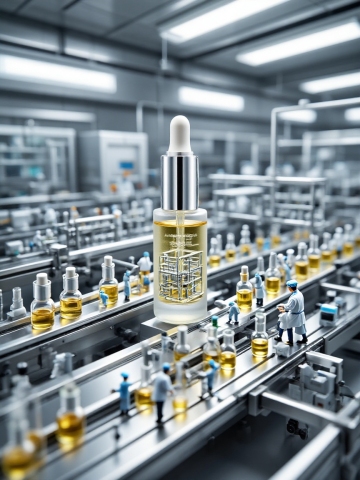现代风,背景浅色渐变蓝白,自动化产线场景:弧形传送带、机械臂、发光舱门,搭配实验室玻璃烧杯/试管架