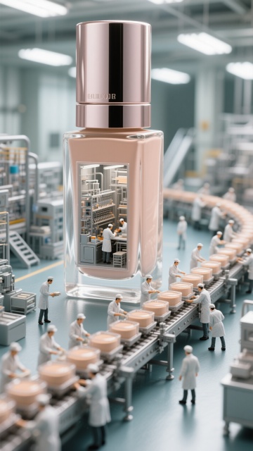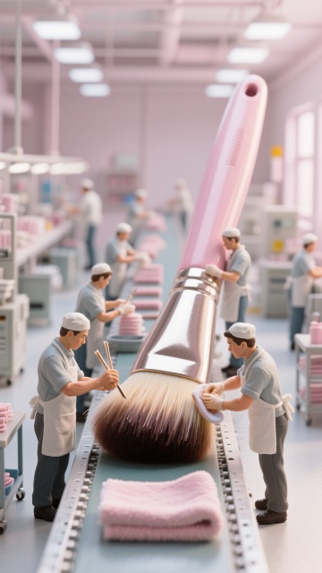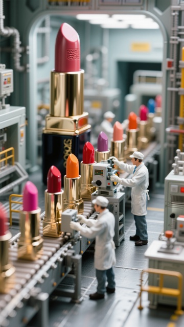 主体建筑为一座巨型透明的立方体空间,银色金属框架包裹全玻璃幕墙。建筑采用三层模块化设计:一层是陈列着眼影盘的门店展区,有迷你店员;二层是眼影盘制作工厂,有传输带和机械臂,穿着实验服的迷你小人在传输带旁边;三层是巨大的立着的眼影盘
