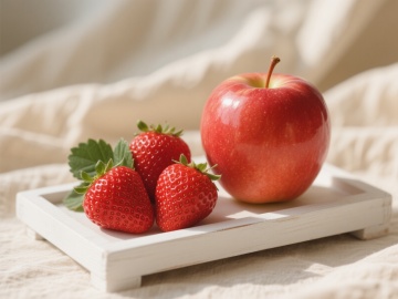 清新草莓与苹果,简约木质托盘,柔和自然光,营造温馨日常氛围。