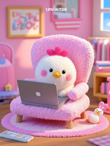 软3D风卡通鸡拟人化,可爱感十足,使用笔记本电脑,营造温馨节日氛围。