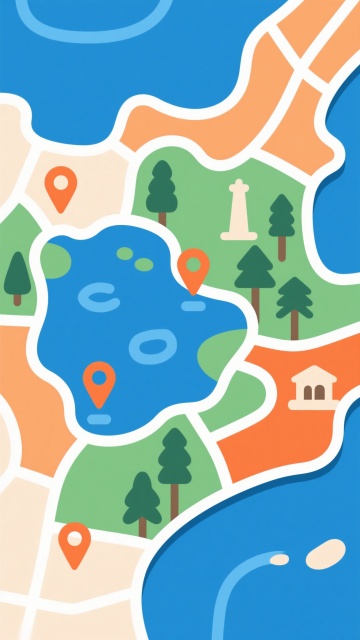 白色背景上,一组不同风格的地图icon,采用扁平化设计风格,线条简洁流畅,边缘有轻微的圆角处理,整体呈现出卡通化的可爱质感。每个地图icon都有独特的造型,有的是不规则的多边形轮廓,内部包含绿色的区域(代表陆地)和浅蓝色的不规则形状(代表水域),还有灰色的蜿蜒曲线(代表道路或河流),部分地图上有醒目的红色定位标记。色彩搭配清新明快,以柔和的米色为地图底色,搭配不同深浅的绿色、蓝色和灰色,营造出简洁明了且友好的视觉效果,符合现代UI设计的审美,适合用于导航、旅行、位置标记等相关的应用界面或图标系统。