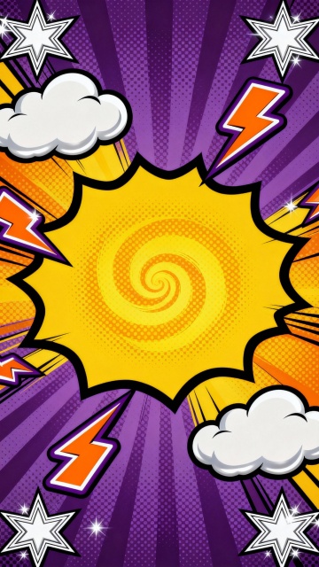 俯视视角,漫画风格特写,霓虹紫色与荧光黄色交织的"BOOM!"字样从破裂的漫画对话框中喷涌而出,字体棱角分明且带有动态速度线,黑色粗描边内嵌着闪烁的白色光点,背景是层层递进的橙红色爆炸波纹与飞溅的星形碎片,中心区域的强光形成放射状眩光效果,整体构图呈现强烈的向外扩张感,白色背景使所有元素如同从纸面弹出般充满张力,完美捕捉到惊喜瞬间的爆发力与视觉冲击。
