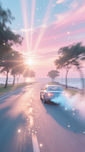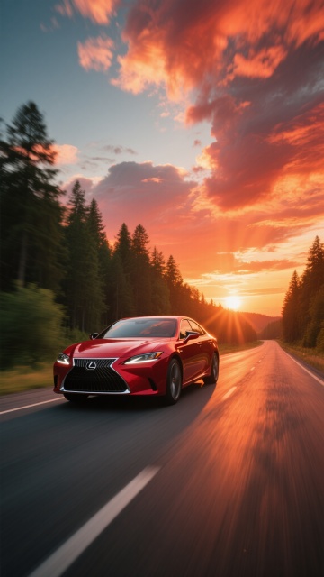 一辆红色轿车在开阔的公路上行驶,车轮带有动态模糊效果,背景是壮丽的日落天空,橙红色的云彩铺满天际,道路两旁有高大的松树,整体画面呈现出写实摄影风格,光线温暖,色彩浓郁,营造出一种自由、动感且充满力量的氛围,车辆细节清晰,金属质感强烈,天空与地面的光影对比鲜明,构图采用三分法,将主体车辆置于画面偏左位置,道路延伸至远方,增强画面的纵深感和视觉引导性。