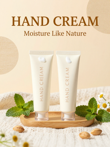 白色背景上,一个斜放的长方形产品包装盒,盒面覆盖着柔和的粉蓝色和浅蓝色大理石纹理渐变图案,顶部左侧有竖排黑色中文文字“随身携带的手部护理”,右侧有竖排黑色英文“CARRY AROUND HAND CARE”,中间偏上位置有一个椭圆形白色标签,内部是黑色中文“海洋精华味”,底部有一条横向的粉蓝色宽幅区域,内部用黑色大写英文字母写着“EPIC HAND CREAM”,背景中有数根交叉的粉蓝色细长线条,整体呈现出现代、清新、简约的设计风格,光线柔和,阴影细腻,营造出宁静舒适的氛围。