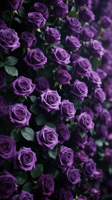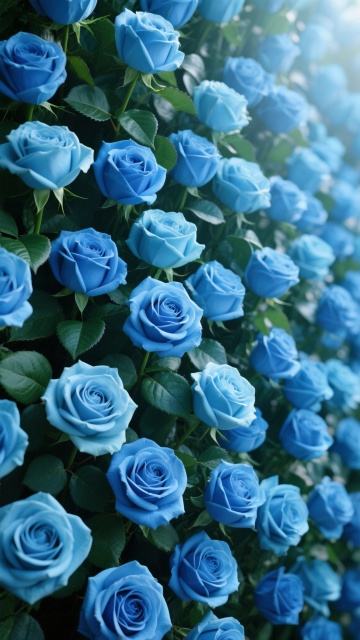 高清摄影风格,一张充满生机与浪漫氛围的玫瑰花墙照片,画面由无数朵形态饱满、层层叠叠的玫瑰花紧密排列组成,形成无缝的花卉背景。玫瑰花的花瓣边缘微微卷曲,展现出细腻的纹理和自然的褶皱,每一朵花都呈现出盛开或半开的状态,充满生命力。深绿色的玫瑰叶片穿插在花朵之间,叶片脉络清晰可见,带有自然的光泽感,为整体画面增添了层次感和色彩对比。光线从上方柔和地洒下,在花瓣和叶片上形成微妙的光影变化,高光部分明亮但不过曝,阴影部分深邃而富有细节,营造出真实的立体感和空间感。色彩方面,玫瑰花整体呈现出鲜艳的天蓝色,从花瓣边缘的浅蓝到花心的深蓝形成自然的渐变,叶片则为深绿色,整体色调清新明快,充满梦幻与浪漫的气息。构图采用满版布局,花朵从画面边缘一直延伸到中心,没有留白,营造出丰富、饱满且极具视觉冲击力的效果,适合作为背景或装饰用途。