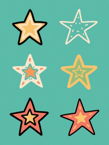 一套由6个不同造型气球束组成的系列插画,每个气球束均保持相同的元素内容:3个圆形气球和2个星形气球通过丝带绑在一起并系有蝴蝶结,采用简约手绘风格,线条为深棕色描边,气球表面有白色高光圆点和弧线,背景为纯色系。6个造型在气球排列方式、大小比例、丝带飘动方向和蝴蝶结样式上各具特色,形成完全不同的视觉呈现,整体以规整的网格状排布,每个气球束的整体色彩方案各不相同,均保持明快活泼的色调,所有元素保持统一的简约卡通风格,画面清晰简洁。