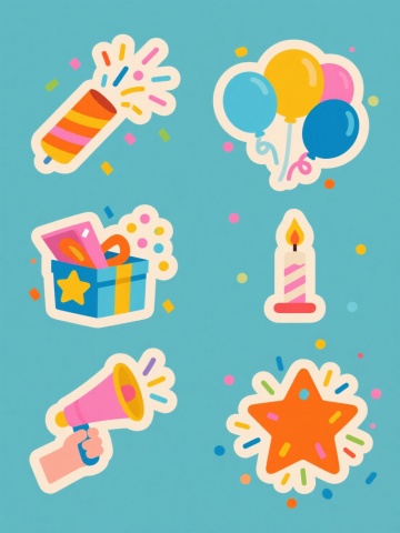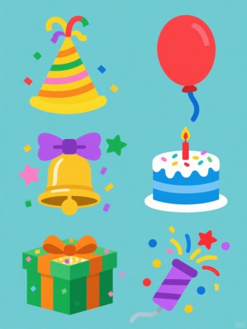 一组6个不同庆典元素的系列图标,每个元素独立排列,均采用扁平矢量插画风格,纯色背景,整体色彩变换但保持明快活泼的庆典氛围。元素包括:1. 黄色条纹派对礼帽,顶部有彩色螺旋彩带和五彩纸屑;2. 红色圆形气球,系着蓝色丝带,下方有飘动的彩色小纸屑;3. 金色铃铛,挂着紫色蝴蝶结,周围有粉色和绿色的星形闪光;4. 蓝色生日蛋糕,带有白色奶油和彩色糖屑,顶部插着一根点燃的红色蜡烛;5. 绿色礼盒,系着橙色蝴蝶结,盒盖微微打开,露出金色光芒和飘落的彩色纸屑;6. 紫色礼花筒,顶部喷射出红色、黄色、蓝色的星形和流线型烟火,周围有散落的彩色圆点。所有元素均保持简洁的线条、鲜明的色块、无渐变阴影的扁平设计风格,确保视觉统一性和庆典主题的连贯性。
