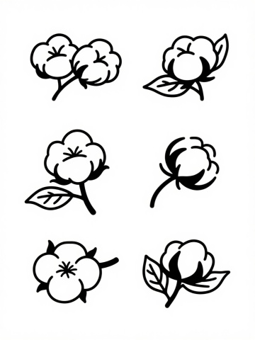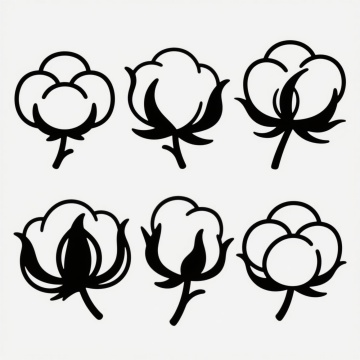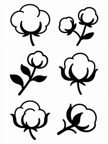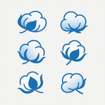 一套六个不同造型和角度的棉花图案,保持原有的简约线条风格,采用统一的浅蓝色配色,所有图案规整地排列在纯白色背景上,每个棉花都有独特的姿态和细节,包括不同的花瓣卷曲方式和叶子形态,整体呈现出协调一致的视觉效果,适合作为系列素材集合使用。