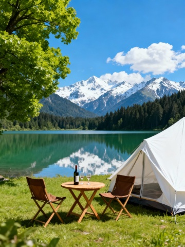 写实风格露营场景摄影,日落时分,深蓝色天空点缀橙红色晚霞,远处是墨绿色山林,前景为绿色草地。中央是白色帐篷,帐篷周围缠绕着暖黄色串灯,帐篷旁立着一把木吉他。帐篷前有燃烧的篝火,火焰明亮,旁边摆放着折叠桌椅,桌上有饮料和食物,一名穿着黑色T恤的男子坐在椅子上,头戴帽子,面向篝火。整体光影柔和,篝火和串灯提供温暖光源,营造出宁静惬意的户外露营氛围,色调和谐,层次分明,细节丰富,无LOGO、文字及二维码。