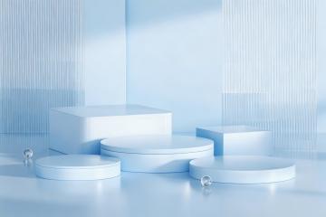 三个白色几何体展示台,由两个大小不一的白色圆柱体和一个白色半圆柱体组合而成,圆柱体表面光滑无纹理,半圆柱体切面平整,整体呈现简洁的现代设计感,所有展示台均采用哑光白色材质,放置在纯白色背景上,光源从左上方照射,在展示台右侧及底部形成柔和的灰色阴影,阴影边缘清晰但过渡自然,整体画面干净利落,具有强烈的空间层次感和极简主义风格。