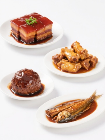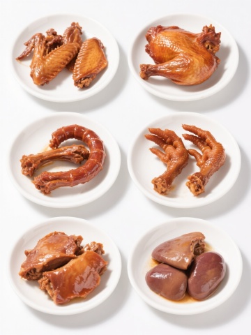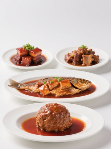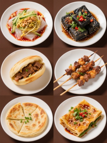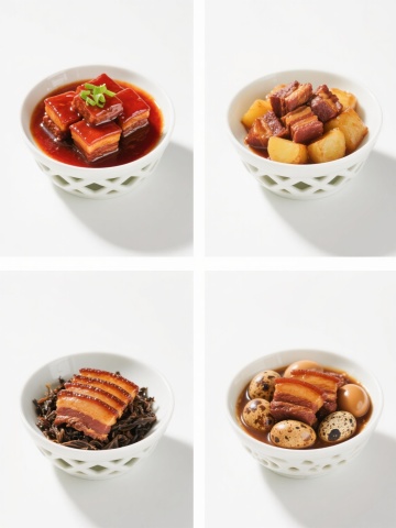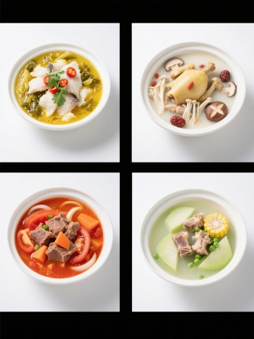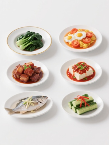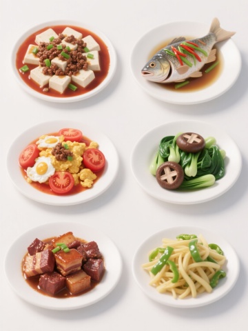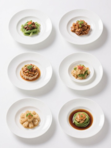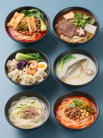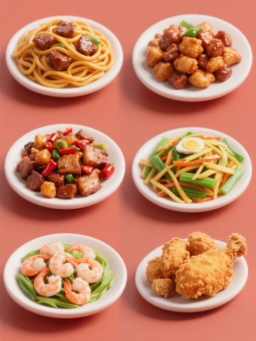 六宫格布局的中式美食系列海报,每张海报为纯色背景,整体色彩变换,保持写实摄影风格,光影运用为柔和顶光,高光表现自然,阴影细节丰富,食物表面质感细腻,酱汁光泽感强。第一张:深棕色粗陶碗中盛放着色泽金黄的三杯鸡,鸡肉块大小均匀,点缀翠绿九层塔,碗边有酱汁滴落;第二张:白色骨瓷盘里摆放着红亮诱人的红烧排骨,排骨肉质紧实,撒有白色芝麻,盘底铺着几片嫩绿生菜;第三张:黑色石锅中沸腾着香辣的水煮鱼,鱼片洁白嫩滑,漂浮着红色辣椒和黄色姜片,汤汁鲜红透亮;第四张:浅蓝色瓷碗中装着热气腾腾的香菇滑鸡粥,粥体浓稠,表面撒有葱花和枸杞,碗边放着一双竹筷;第五张:粉色磁盘里码放着精致的虾饺皇,饺子皮晶莹剔透,隐约可见里面的鲜虾,旁边放着一小碟醋;第六张:绿色荷叶盘中盛着香煎三文鱼排,鱼肉呈橙红色,外皮金黄酥脆,搭配柠檬片和绿色时蔬。每张海报视觉层级清晰,食物主体突出,背景纯色简洁,整体设计符合中式美食宣传的目标受众审美,信息传达效率高,排版整齐规整,六宫格元素类目相同,风格统一。