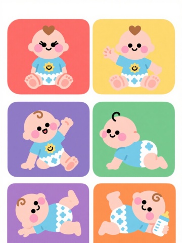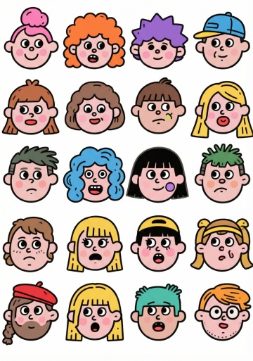 9个不同配色、不同表情、不同造型的卡通表情包,采用简约扁平风格,白色背景,上下两行对齐排列。每个表情包均为圆形头部,包含黑色弧形眉毛、不同设计的眼睛(如圆形眼珠带高光、星星形状、心形)、各异的嘴巴(张开的红色嘴唇、微笑弧线、半圆形、惊讶的小圆形),以及脸颊上的粉红色圆形腮红。线条简洁流畅,色彩鲜明,表情生动多样,整体呈现可爱、萌系的视觉效果,构图整齐对称,画面干净清爽。