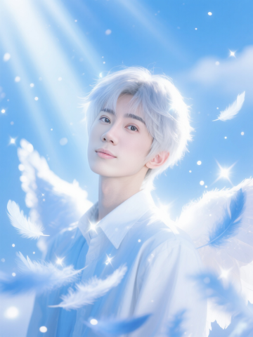 特写镜头,唯美精致的天使少年(奶油肌,银色的头发,白蓝色穿搭,发着光),环绕无数动态模糊的蓝白调发光羽毛,大光圈虚化的天空背景