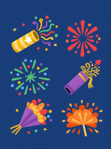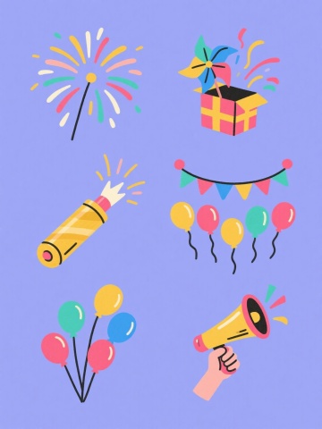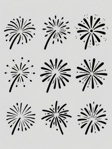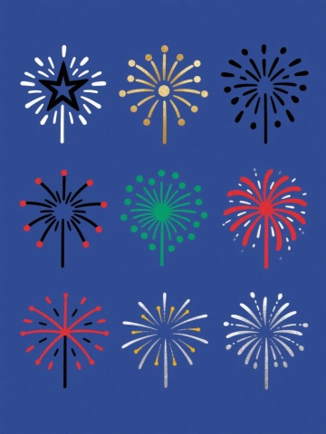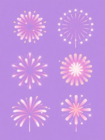 一系列6个造型与角度各不相同的烟花图案规整排布的集合,保持原图的平面设计风格、半透明渐变质感、明亮柔和的光影效果,采用统一的蓝色与紫色渐变配色,每个烟花均由放射状线条与光点构成,整体背景为纯色,画面整体色彩变换为蓝色与紫色的渐变色调,各烟花元素在保持核心视觉特征的前提下呈现出多样化的绽放形态与空间角度,整体布局整齐有序。