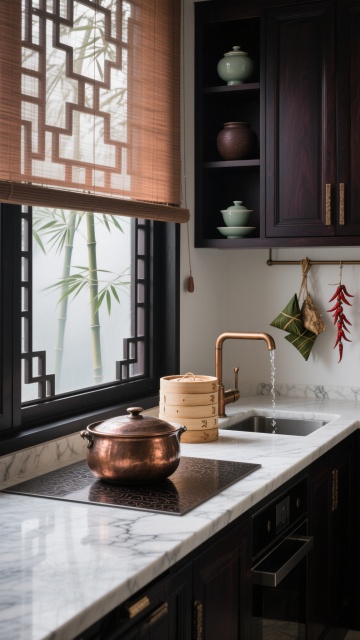 中景构图,一个融合东方禅意与现代工业美学的开放式厨房,哑光黑色火山岩台面与胡桃木柜体形成深沉对话,墙面是手工抹制的灰泥质感,中央悬挂着一盏由七根竹节串联而成的悬浮式吊灯,自然光透过磨砂玻璃推拉门在地面投下朦胧的光影,岛台边缘嵌入一条细长的流水槽,水面倒映着上方悬挂的铸铁锅具,台面上静置着一个粗陶茶碗和一株小型苔藓盆景,右侧墙面悬挂着一排铜制调料罐与竹制蒸笼,整体色调为深胡桃木色、哑光黑与苔藓绿的和谐共生,空气中弥漫着淡淡的原木清香与微湿的水汽。