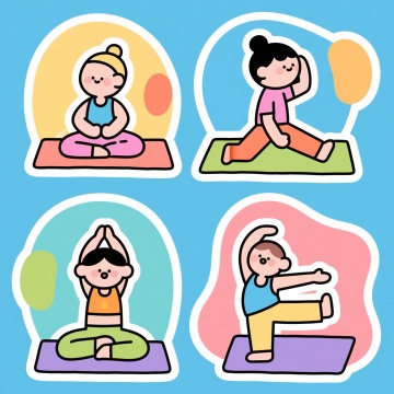 一系列6个不同运动元素的扁平化风格插画,每个插画中都有一个正在进行不同运动的人物,人物造型为简约的卡通风格,身体比例略显夸张,线条流畅圆润,使用纯色填充,边缘有清晰的描边。每个运动场景都有独特的动作和道具,分别是:1. 正在跑步的人物,穿着运动服和跑鞋,双臂前后摆动;2. 正在做瑜伽的人物,双腿盘坐,双手合十放于胸前;3. 正在打篮球的人物,双手持球准备投篮;4. 正在游泳的人物,身体呈流线型,双臂向前伸展;5. 正在骑自行车的人物,双手扶把,双脚踩踏板;6. 正在举重的人物,双手紧握杠铃,双臂弯曲将杠铃举至胸前。每个插画都有独立的纯色背景,整体色彩变换丰富,分别采用不同的主色调,保持整体风格统一,所有插画规整排布,形成一个系列素材集合。