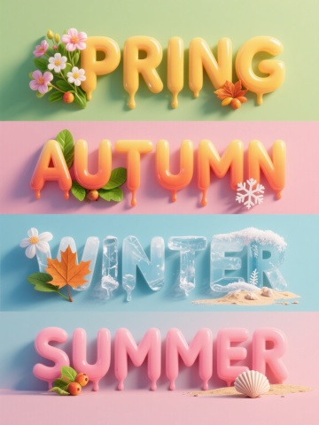 6个不同材质的夏日主题元素系列集合,保持原元素内容和造型,规整排布在纯色背景上。每个元素都有独特的材质和整体色彩:第一个是蓝色透明充气材质的“Summer”字样,搭配黄色笑脸太阳、橙色水果和蓝色救生圈;第二个是粉色磨砂玻璃材质的“Summer”字样,搭配粉色笑脸太阳、红色水果和粉色救生圈;第三个是绿色金属材质的“Summer”字样,搭配绿色笑脸太阳、绿色水果和绿色救生圈;第四个是紫色塑料材质的“Summer”字样,搭配紫色笑脸太阳、紫色水果和紫色救生圈;第五个是黄色木质材质的“Summer”字样,搭配黄色笑脸太阳、黄色水果和黄色救生圈;第六个是红色陶瓷材质的“Summer”字样,搭配红色笑脸太阳、红色水果和红色救生圈。所有元素都具有3D立体效果,光影过渡自然,整体风格统一且充满夏日气息。