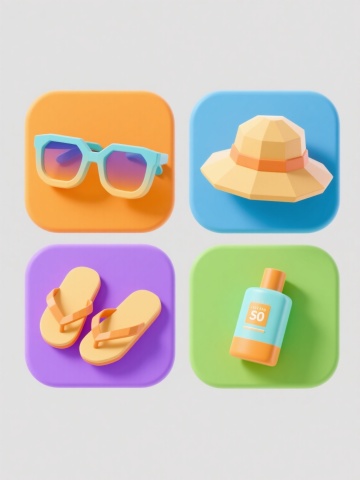 六个系列素材集合,每个素材均为纯色背景下的3D立体风格夏日元素造型,保持相同的圆润厚实3D质感、明亮饱和的色彩搭配(黄色、蓝色、紫色、粉色为主色调)、细腻的光泽反射和柔和阴影效果。系列造型分别为:1. 黄色救生圈与蓝色"SUMMER"文字组合,点缀粉色小铲子和粉色海星;2. 彩色冲浪板斜靠在立体波浪形"SUMMER"文字旁,搭配橙色小沙堆;3. 冰淇淋造型的立体字母组合,顶部有融化滴落效果,周围环绕彩色气泡;4. 海滩遮阳伞与躺椅组合,伞面为蓝白条纹,躺椅上放有彩色毛巾;5. 漂浮的彩色游泳圈和水波纹立体图案,点缀水滴和气泡元素;6. 立体椰子树与沙滩球组合,树下有小贝壳和脚印装饰。所有素材均采用相似的构图布局,元素排布规整有序,整体风格统一且充满夏日欢快氛围,无任何文字、LOGO、电话地址及二维码。