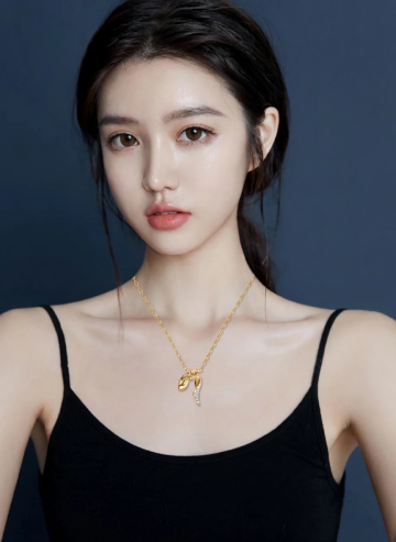 半身构图,亚洲年轻女性微微侧身45度,左手无名指轻触锁骨处珍珠项链的坠子,右手自然垂落于身侧,浅棕色中长发在柔和光线下呈现出蜜糖般的层次感,几缕发丝随动作轻轻拂过纤细的脖颈。自然妆容强调通透质感,浅棕色眉毛如自然生长般柔和,内眼线仅在眼尾处微微上扬,淡粉色眼影如晨雾般晕染眼窝,珊瑚色唇膏中央点缀着一丝透明唇蜜,光泽感底妆在偏侧光下展现出细腻的皮肤纹理。简约的金色几何耳坠随着头部微倾的弧度轻轻晃动,白色丝质吊带裙的肩带在肩胛骨处形成优雅的V形线条,背景是带有微妙纹理的奶油白,光线从左上方45度角温柔洒落,在颈部和锁骨处形成渐变的柔光过渡,整体氛围如同被时光定格的静谧午后,极简主义构图中蕴含着含蓄的优雅张力。