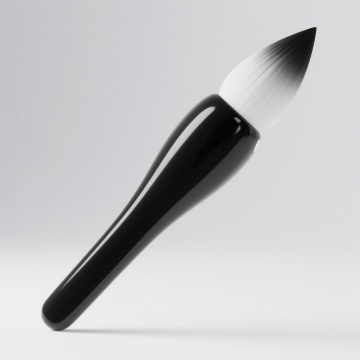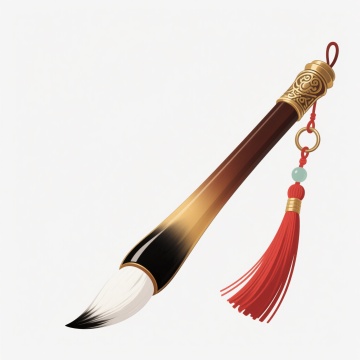 一支精致的传统毛笔,笔杆为棕红色木质,带有深色条纹纹理和金属箍装饰,笔尖乌黑浓密,毛笔倾斜放置,笔尖蘸取浓黑墨汁,在白色背景上挥洒出一道自然流畅、富有动感的黑色墨痕,墨痕边缘有飞溅的墨点,整体呈现出国画特有的笔墨韵味和东方美学意境,画面简洁大气,突出毛笔的形态美与墨的流动感,具有浓厚的国风文化气息。