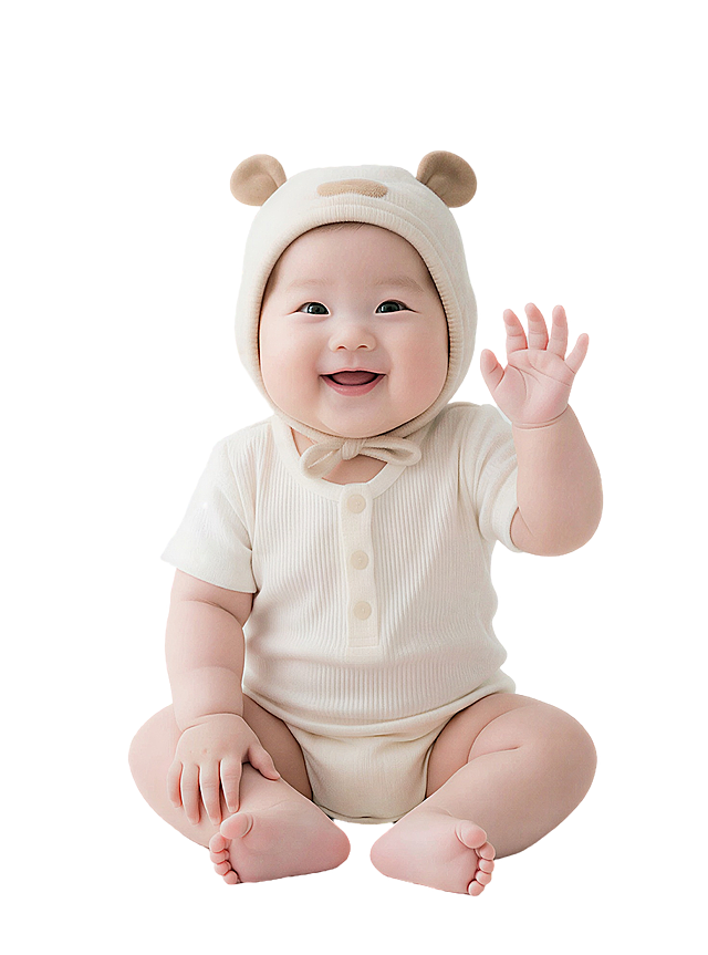 超写实风格婴儿肖像,正面坐姿,棕色短发,明亮蓝色大眼睛,圆润脸颊,嘴角微扬露出可爱笑容,穿着白色短袖T恤(印有卡通图案和文字元素)与灰色格纹短裤,皮肤白皙细腻有光泽,光线柔和均匀来自前方,阴影自然过渡,构图居中,背景纯白色,整体画面清晰明快,展现婴儿天真无邪的神态与精心搭配的服饰装扮细节。详情
