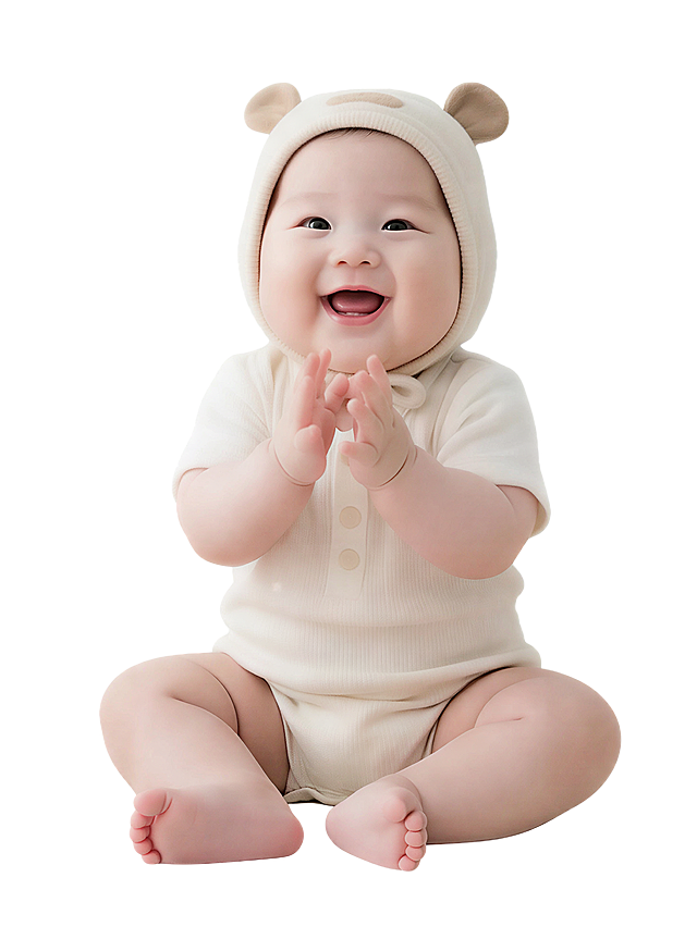 高清写实风格婴儿肖像,健康白皮肤,棕色短发,明亮蓝色大眼睛,圆润脸颊,微微上扬的嘴角露出可爱笑容,穿着印有卡通图案的白色短袖T恤和浅色条纹短裤,双手交叠放在小腿上,盘腿坐姿,整体画面简洁干净,光线明亮柔和,突出婴儿纯真可爱的神态和服饰装扮细节。详情