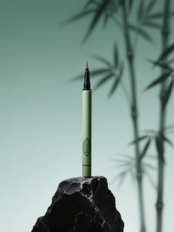 一支真实照片风格的传统毛笔,笔杆为棕红色木质,表面光滑有自然纹理,顶部连接黑色笔帽,笔帽顶端系着一个鲜红色的圆形挂绳。笔头由白色和浅灰色的动物毛发组成,呈锥形,笔尖尖锐,毛发根部包裹着黑色金属箍,整体悬浮在纯白色背景中,光线柔和均匀,突出毛笔的质感和细节,无任何文字、LOGO或装饰元素。