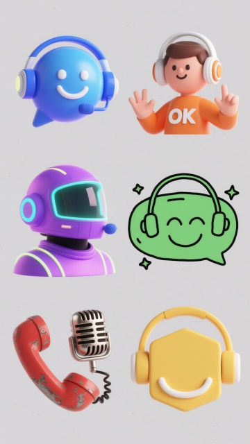 六个保持客服主题但外观、色彩、风格和元素各异的客服图标,排列整齐成两行三列。第一个图标:蓝色渐变3D立体语音气泡戴着蓝色耳机和麦克风,圆形笑脸表情,光滑材质,柔和阴影。第二个图标:扁平化设计的橙色客服小人,戴着白色耳机,双手比出“OK”手势,简洁线条,无渐变。第三个图标:紫色赛博朋克风格的客服头盔,带有霓虹灯光效果,透明面罩,科技感十足。第四个图标:绿色手绘风格的客服对话框,耳机为卡通线条,笑脸为波浪线,背景有小星星点缀。第五个图标:红色复古电话听筒与现代麦克风结合的客服标志,金属质感,有轻微做旧效果。第六个图标:黄色极简主义客服符号,由耳机轮廓和微笑曲线组成,几何形状,单色填充。所有图标风格统一为图标设计,大小一致,间距相等,整体视觉平衡。