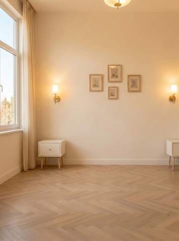 高仿真木地板材质背景,浅橡木色调,长条形地板呈人字形交错拼接,表面有清晰自然的木纹肌理,包括细密的导管纹和山形纹理,整体色调统一为温暖的浅米色至浅棕色渐变,光线均匀柔和,呈现出哑光至半哑光的细腻质感,无明显反光,接缝处处理精细自然,营造出干净、简约、自然的空间氛围。