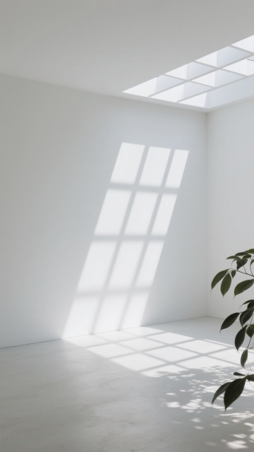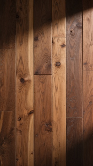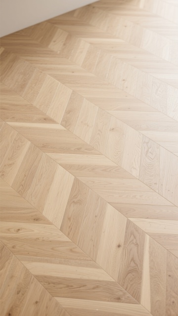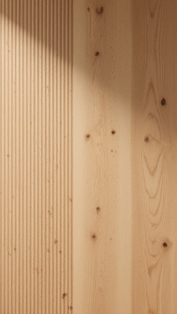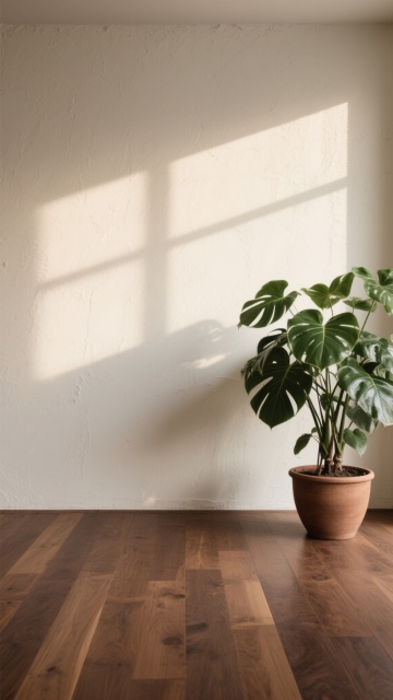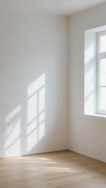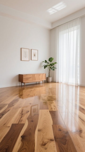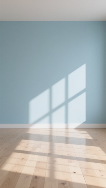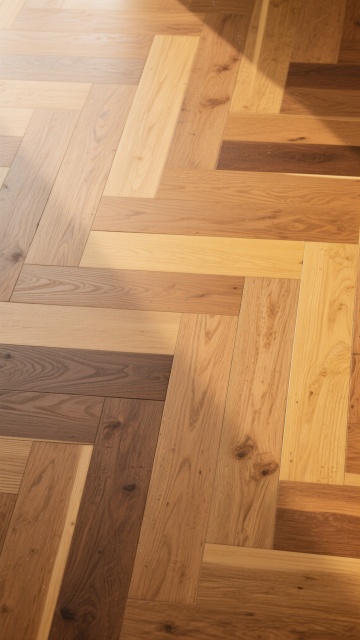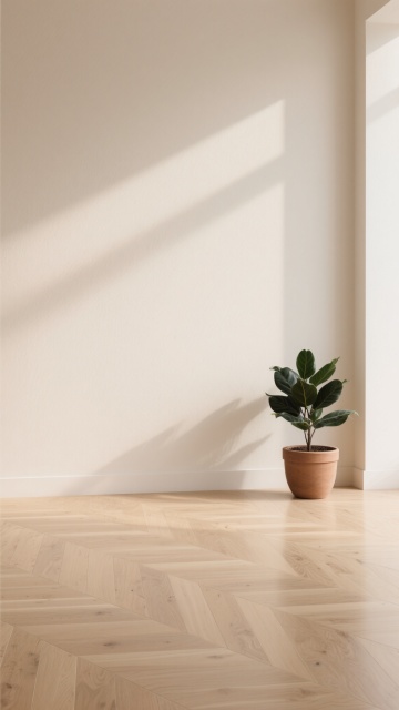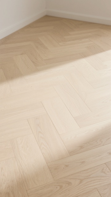 极简主义室内场景,浅色木地板为主体,地板纹路呈现不同的自然木纹肌理,包括直纹、山纹和波浪纹等多种纹路变化,配色涵盖浅橡木色、白枫木色、浅胡桃色等不同浅色木色调,地板接缝清晰自然,表面有细腻的哑光光泽,阳光从左上方斜射形成柔和的光影效果,墙面为米白色,墙角有白色踢脚线,整体氛围明亮、干净、通透,具有现代简约的设计感。