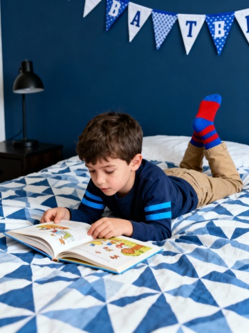 温馨静谧的卧室场景,柔和的暖黄色床头灯光线洒在熟睡的小女孩脸上,她身着白色背心,侧卧在床上,双手托腮,嘴角带着浅浅的微笑,盖着米白色的被子,床头有一个深色的圆形小床头柜,整体画面采用写实摄影风格,光影层次丰富,阴影自然柔和,色调以温暖的米黄与深蓝紫色暗调为主,营造出宁静、舒适、充满安全感的夜晚睡眠氛围,展现出卧室空间的温馨与安逸。