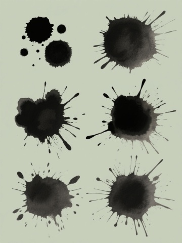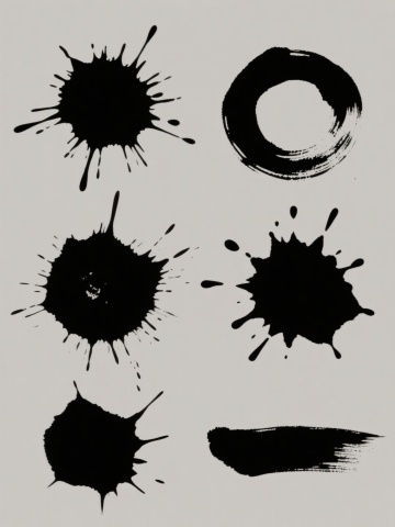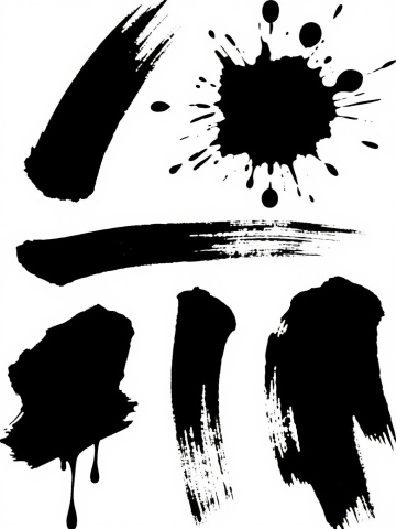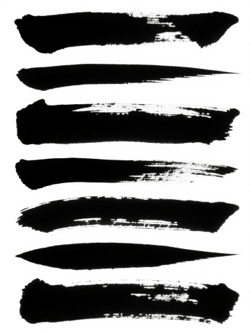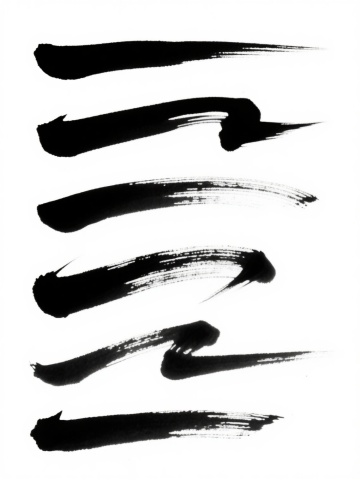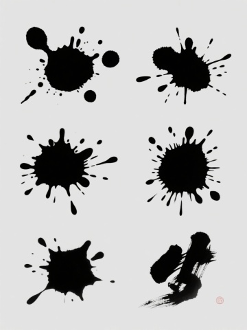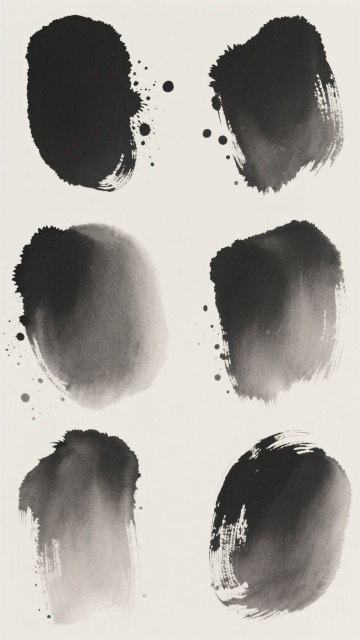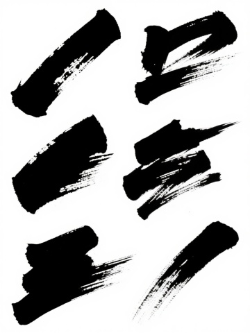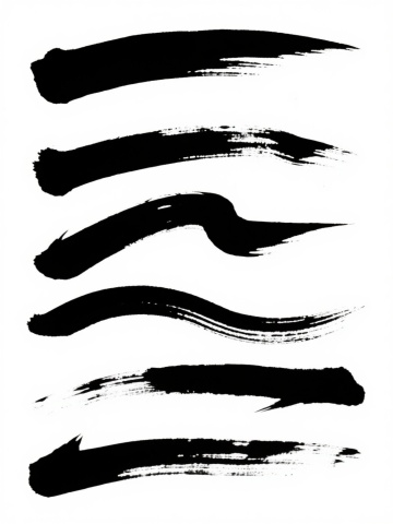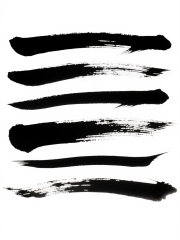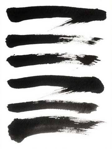在纯白色背景上,以粗犷有力的黑色水墨笔触风格,生成6个完全不同造型的同系列抽象墨迹素材集合,每个墨迹保持黑色主色调和自然的笔触纹理,呈现出不同的形态和角度,包括横向挥洒、纵向拖曳、圆形晕染、棱角分明的几何笔触、S形曲线以及不规则的飞溅状笔触,所有墨迹元素规整地排布在画面中,彼此之间留有适当空隙,整体保持一致的手绘水墨质感和黑白对比强烈的视觉效果。