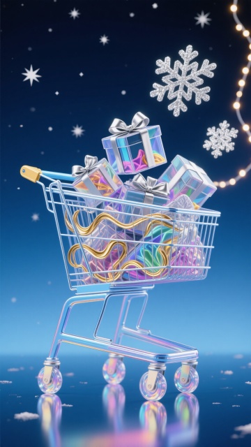 一个蓝紫色渐变金属质感的购物车,车身有几何切割棱角,车轮是透明亚克力材质带彩色光晕,车内装满透明水晶礼盒、发光霓虹色“SALE”标牌和漂浮的全息货币符号,背景是赛博朋克风格的霓虹网格,点缀着破碎的几何星星和六边形光斑,整体呈现未来科技感的电商促销氛围,高对比度光影,光滑反光材质,立体感强。