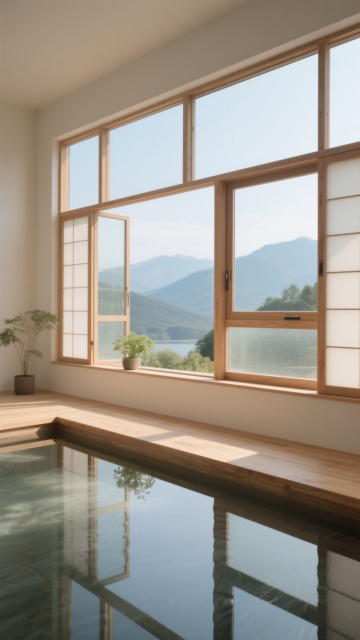 极简主义风格的室内场景,画面聚焦于不同角度、场景和布置的木质框架窗户,部分窗户为半透明磨砂玻璃推拉门设计,窗外可见开阔的蓝天、远山轮廓和近处的绿色草坪,室内地面铺设浅色哑光材质,一侧墙面为竖条纹木质面板,自然光从窗外柔和洒入,形成清晰的光影层次感,整体色调以原木色、米白色和浅灰色为主,营造出宁静、通透、自然的氛围,窗户在不同场景中呈现出多样的开启方式和与周围环境的互动关系,如部分窗台下布置小型绿植,部分窗户与室内水体元素相呼应,展现简约而富有设计感的空间美学。