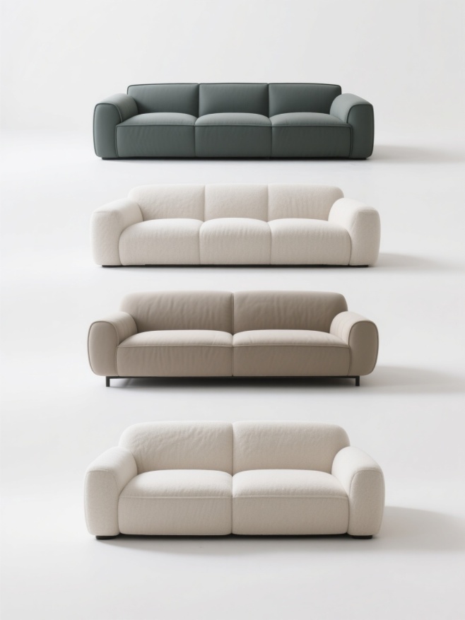 极简主义家居产品展示图,白色纯净背景,上下两行对齐排列四个不同配色、不同样式、不同材质的沙发造型,每个沙发保持原图中清晰的产品摄影风格,柔和均匀的顶光照明,细腻的材质纹理表现,平滑的线条轮廓,自然的阴影投射,高清晰度,专业家居产品 catalog 视觉呈现,无任何文字、LOGO及装饰元素。