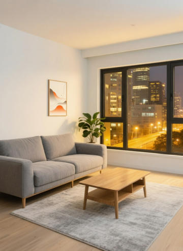 俯视角构图,极简主义风格客厅,整体以冷灰色、深靛蓝和哑光黑为主色调,营造出冷静克制的未来感氛围。傍晚时分,右侧墙面的悬浮式几何窗格精准切割着渐暗的天光,在深灰色微水泥地面投射出规则的菱形阴影图案。房间中央是一个模块化的深靛蓝色布艺转角沙发,表面呈现细腻的纹理褶皱,沙发上随意摆放着两个同色系但不同材质的靠垫——一个光滑如丝,一个粗粝似麻。沙发前是一块超大尺寸的浅灰色羊毛地毯,边缘故意做旧处理,地毯中央悬浮着一个由哑光黑金属框架支撑的透明亚克力茶几,茶几上放置着一个极简线条的黑色陶瓷花瓶,里面插着三支干枯的黑色芦苇。沙发左侧墙角矗立着一盆形态遒劲的琴叶榕,深绿色叶片在冷光下呈现出近乎黑色的剪影,种植在一个带有细微凹痕的手工浇筑混凝土花盆中。沙发背景墙采用了深浅不一的灰色渐变处理,中央悬挂着一幅无框的几何抽象画,画面由精确的黑色直线和大小不一的白色方块构成,画作下方是一个悬浮式的黑色橡木电视柜,表面只放置了一个造型极简的白色音响。天花板采用无主灯设计,而是在不同区域嵌入了可调节角度的线性LED灯带,光线均匀地漫射在整个空间,强调出墙面的微妙肌理和家具的利落线条。地面采用600×600mm的深灰色哑光瓷砖,以30度角错位拼接,缝隙间填充同色系美缝剂,形成整体感极强的视觉平面。整个空间布局遵循"少即是多"的原则,每一件家具都经过精心挑选,线条锐利如刀锋,光影层次分明,呈现出一种冷静而富有力量的空间美学。