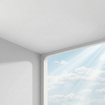 明亮通透的简约场景,纯净的白色立体几何平台由两块水平叠加的长方体构成,右下角平台边缘处放置着两朵盛开的白色小雏菊,黄色花蕊清晰可见,绿色花茎带着嫩叶自然舒展,背景是清澈的蓝天,点缀着形态柔和、边缘清晰的白色云朵,阳光从左上方洒落,在平台上形成淡淡的阴影,整体风格清新自然,画面简洁干净,充满宁静愉悦的氛围,光影柔和,色彩明快,具有高清晰度和细腻的质感表现。