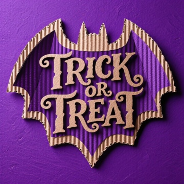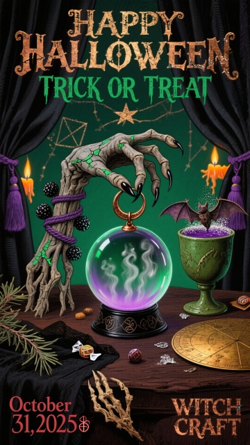 哥特式风格的万圣节标题设计,"HAPPY HALLOWEEN"以尖锐、扭曲的黑色哥特式字体呈现,字母边缘带有破损和尖刺装饰,内部填充深红色渐变,仿佛凝固的血液;中间的南瓜头图标改为雕刻精细的骷髅南瓜,眼窝和嘴巴透出幽幽绿光;下方"TRICK OR TREAT"采用手写式哥特字体,字尾带有飘逸的黑色蝙蝠翅膀装饰,整体文字组合在纯黑色的纯色背景上,边缘有暗红色的发光效果,营造出神秘、诡异又华丽的哥特式万圣节氛围。