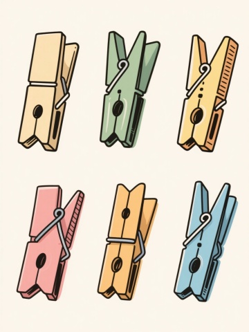 六个不同配色、不同样式、不同材质的夹子造型,采用上下两行对齐排列,每个夹子都具有光滑的表面和清晰的金属弹簧结构,展现出各自独特的色彩(如红色、蓝色、黄色、绿色、紫色、橙色等)、样式(如长尾夹、圆形夹、扁平夹等)和材质质感(如金属光泽、塑料磨砂、木质纹理等),背景为浅色,整体画面简洁干净,呈现出扁平化的图标设计风格,线条流畅,细节清晰,无任何文字或二维码元素。