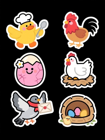 一套6个完全不同元素的家禽主题卡通素材集合,保持与原图一致的平面卡通风格,白色纯色背景,黑色清晰轮廓线,鲜艳的色块填充。每个元素都具有圆润可爱的造型、夸张的表情和动态姿势:1. 一只戴着厨师帽、手持汤勺的黄色小鸭子,翅膀展开,面带微笑;2. 一个带有笑脸表情、戴着小花的粉色鸡蛋,蛋壳上有裂纹;3. 一只正在打鸣的红色公鸡,头部高昂,翅膀微张;4. 一只正在下蛋的白色母鸡,蹲在鸡窝上,表情专注;5. 一只戴着围巾的灰色小鸽子,嘴里叼着一封信,翅膀飞翔状;6. 一个卡通化的鸡窝,里面有三个不同颜色的鸡蛋,旁边有一只小鸡在啄米。所有元素规整排布,保持统一的风格、大小比例和视觉效果,无任何文字、LOGO、二维码及多余信息。