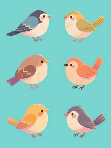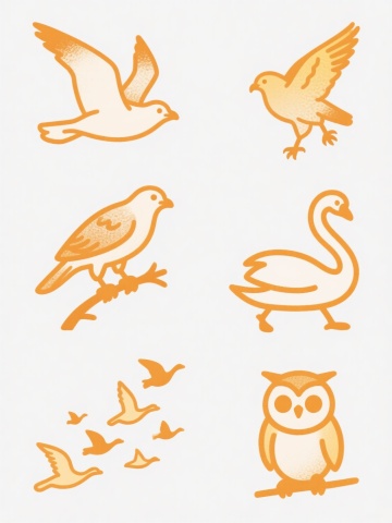 一组6个完全不同元素内容的系列素材集合,每个元素都采用与原图一致的风格——简洁的手绘风线条勾勒,搭配温暖的橙黄色渐变填充,边缘带有轻微的纹理笔触效果,背景为纯白色。元素内容保持与鸽子同类目的飞鸟主题,分别为:1. 展翅盘旋的海鸥,翅膀呈现流线型弧度,尾部羽毛分岔;2. 站立枝头的麻雀,体型小巧,头部圆润,短喙微张;3. 俯冲姿态的猎鹰,双翼后收,利爪前伸,眼神锐利;4. 优雅踱步的天鹅,长颈弯曲呈“S”形,尾羽散开如扇形;5. 群飞的大雁,呈“人”字形编队,翅膀同步挥动;6. 停歇的猫头鹰,圆头大眼,双耳耸立,身体胖乎乎。所有元素均为规整排布的独立图案,无背景干扰,线条流畅且富有动感,整体设计简洁明快,符合平面设计素材的使用需求。