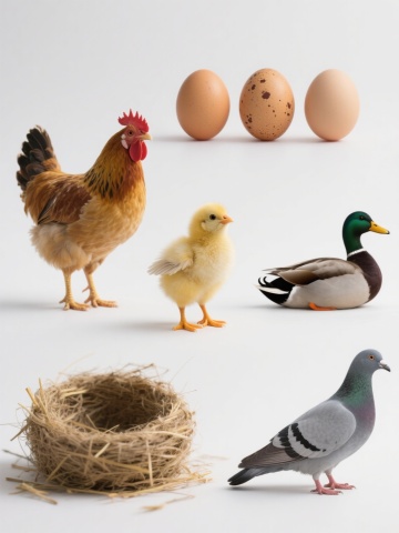 超写实风格的家禽系列素材集合,纯白背景,6个规整排布的独立元素,每个元素保持高度细节的摄影级质感和自然光影效果。从左到右、从上到下依次为:1. 站立的棕色母鸡,羽毛呈现暖黄色与深褐色渐变,尾部羽毛蓬松,头部有红色鸡冠和肉垂,眼神温和;2. 三个浅褐色带深棕色斑点的椭圆形鸡蛋,表面有细微的纹理和光泽,紧密排列;3. 一只黄色绒毛的小鸡,翅膀微张,抬头看向斜上方,脚爪细小呈橙黄色;4. 一只黑白相间的鸭子,身体肥胖,脖子弯曲,嘴巴扁平呈橙黄色,翅膀收拢紧贴身体;5. 一个编织的鸡窝,内部铺有干草,边缘有几根稻草散落;6. 一只灰色的鸽子,翅膀上有黑色条纹,尾巴展开呈扇形,站立姿态优雅。所有元素色彩真实自然,边缘清晰无阴影,整体构图平衡对称,每个元素大小一致,间距均匀。