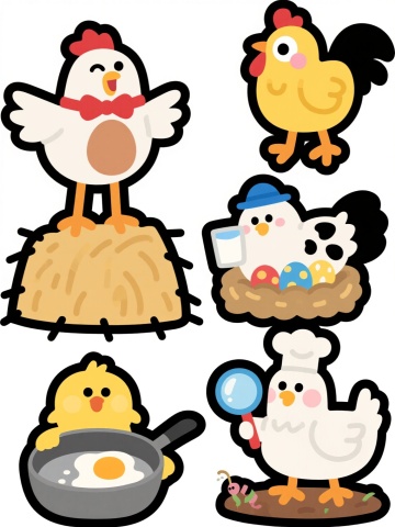 一套以纯白为背景的6个农场鸡元素卡通插画系列素材,保持统一的儿童风格2D平面设计,黑色粗轮廓线勾勒,色彩鲜明且色块平涂无渐变,每个元素都具有圆润可爱的造型、夸张的大眼睛和友好的表情。第一个是戴着红色蝴蝶结、翅膀环抱一颗棕色鸡蛋的白色母鸡;第二个是站在稻草堆上引吭高歌、眼睛眯成月牙状的黄色公鸡;第三个是戴着蓝色小帽子、爪子捧着一杯牛奶的白色小鸡;第四个是趴在窝里、翅膀下露出几颗彩色鸡蛋的黑白花母鸡;第五个是戴着厨师帽、手持煎锅、锅里有个煎蛋的拟人化黄色小鸡;第六个是站立着、爪子拿着放大镜观察地面上小虫的好奇白色母鸡。所有元素规整排布,大小均匀,保持相同的卡通风格和视觉语言,整体呈现出欢快、友好、适合儿童的氛围。