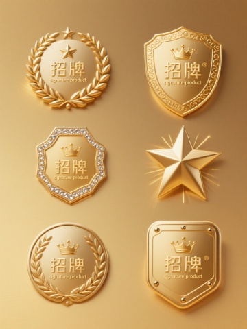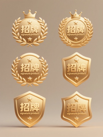 一组6个金色徽章系列素材,每个徽章均保持核心元素:中文“招牌”文字、英文“signature product”、顶部小皇冠,采用相同的金色渐变金属质感、高光阴影表现和精致细节刻画,背景为纯色白色。6个徽章造型完全不同:1. 圆形徽章,外围环绕月桂枝叶和顶部五颗五角星;2. 盾形徽章,边缘有卷草花纹装饰;3. 方形徽章,四角为圆角处理,边框有回纹图案;4. 星形徽章,五角星形轮廓,内部圆形区域放置文字;5. 椭圆形徽章,两侧有对称的翅膀元素;6. 菱形徽章,每个角有小圆形装饰。所有徽章规整排布,保持统一的3D立体风格、金色调色彩和谐、光影效果和高品质质感,形成风格统一又造型多样的系列设计。