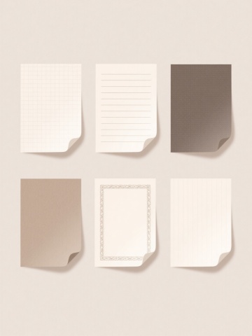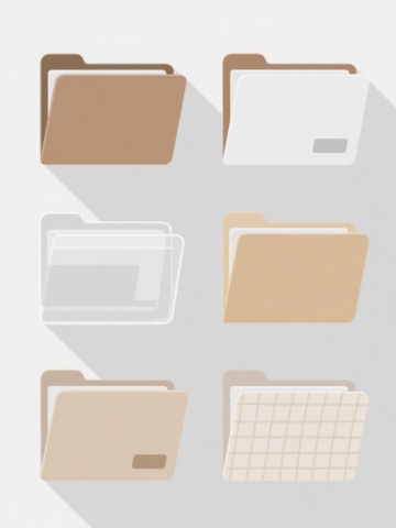 扁平化设计风格,六个不同样式和材质的文件夹排列整齐,白色背景,配色简洁,采用简约的矢量线条和块状填充,柔和的阴影营造轻微立体感,文件夹形态包括带金属夹子的牛皮纸材质、侧边白色标签的蓝色塑料材质、带按扣的棕色皮质材质、半透明磨砂质感的绿色材质、带拉链的灰色帆布材质和条纹纹理的黄色硬纸板材质,整体构图均衡,物体边缘清晰,色彩明快且和谐统一,符合简洁办公用品的视觉传达需求。