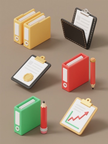 一组六个保持相同元素内容的系列素材集合,每个素材均为等距等大的2.5D等轴测视图风格办公文件组合,包含三个直立的文件夹、一个打开的黑色皮质文件夹、一支红色铅笔、一张带有折线图表和金色印章的白色文件纸,所有元素线条简洁明快,边缘锐利无渐变,采用纯色填充,无阴影无纹理,背景为单一纯色;六个素材整体色彩方案完全不同,分别使用六组高对比度、和谐统一的不同色相纯色进行填充,每个素材中的文件夹、皮质夹、铅笔、图表线条、印章等元素均使用对应色彩方案内的不同纯色;六个素材规整排布,形成两行三列的网格布局,彼此间距均等,整体构图平衡对称,具有清晰的视觉层级和高效的信息传达效率,符合现代简约办公设计风格,适合作为系列图标或素材模板使用。