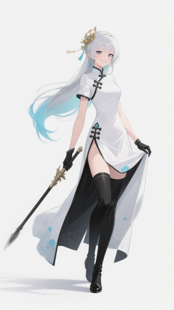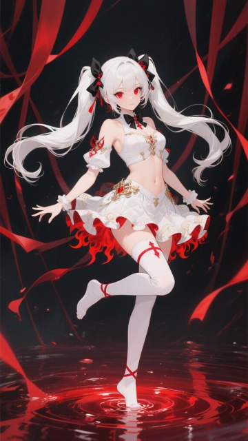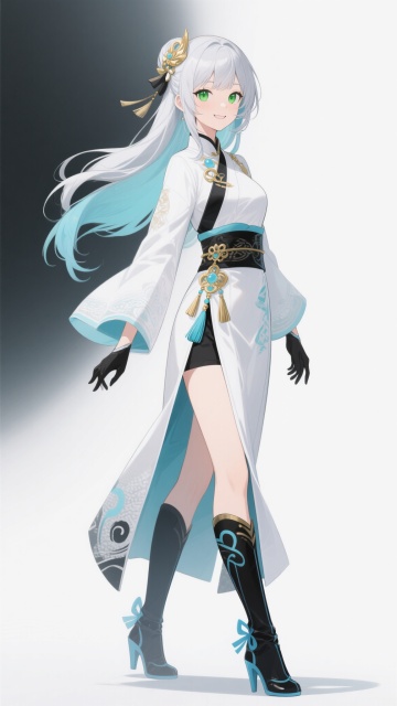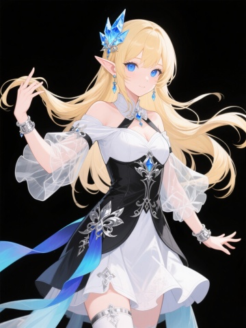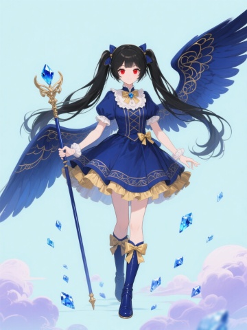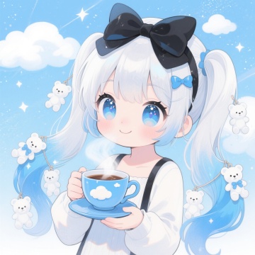 日系二次元动漫风格少女插画,以天蓝色和淡紫色为主色调,柔和的光影效果,画面充满梦幻感和透明感。画面中央是一位银发双马尾少女,她有着蓝色渐变的眼瞳,眼尾微微上扬,此刻正歪着头,嘴角带着俏皮的微笑,一只手托着脸颊,另一只手拿着一个带有星星图案的魔法棒,魔法棒顶端闪烁着微光。少女穿着带有蓝色蝴蝶结和蕾丝花边的黑色连衣裙,袖口和裙摆处有白色绒毛装饰。她的头发上系着蓝色丝带,发间点缀着小巧的星星发饰。背景是淡蓝色的天空,漂浮着白色的云朵和闪烁的星星,周围环绕着几只可爱的白色小幽灵,它们有着黑色的眼睛和微笑的嘴巴,正围绕着少女飞舞。整体构图采用中心聚焦式,少女位于画面中央,背景元素分布均匀,营造出一种欢快、灵动的氛围。